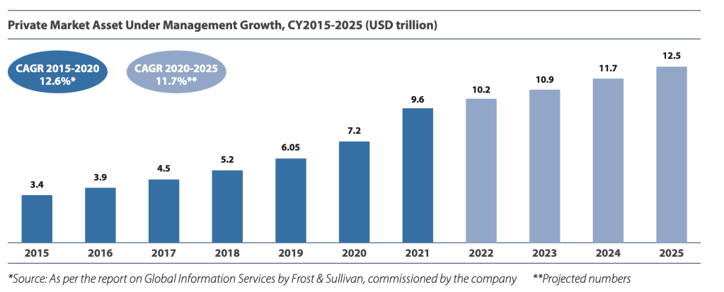 Private market asset management industry managed close to 9.6 trillion dollars during 2021 and recorded a growth of 12% on CAGR basis from 2015 to 2020. The industry is expected to hit a size of 12 trillion dollars under management by 2025, posting a growth of 11.7% on CAGR basis from 2021 as per report from Frost & Sullivan. The number of addressable market for private market data platforms stands at 100,000 organisations at a global level. These include investment banks, private equity funds, venture capital funds, corporate M&A departments of large corporates, universities, etc. Number of PE firms has grown from 7,800 in 2015 to 19,512 in 2021. Number of investment banks has also grown from 6,058 in 2015 to 11,923 in 2021. Number of VC funds has grown from 12,873 in 2021 to 27,506 in 2021. Total available market size stood at 2.58 billion dollars as of 2021. It refers to the market that has not yet been fully penetrated and still has opportunities available. Total addressable market stood at 1.19 billion dollars in 2021. It refers to the market that is being serviced by private market data players currently. Currently private market investors make up about 55% of the total addressable market while corporates make up about 31% and rest is accounted by others as of 2020. North America makes up 44% of the total addressable market, EMEA (28%), APAC (26%) and RoW (2%) as per 2020. According to Frost & Sullivan, market penetration is expected to improve from 52% in 2020 to as high as 65% by 2025.