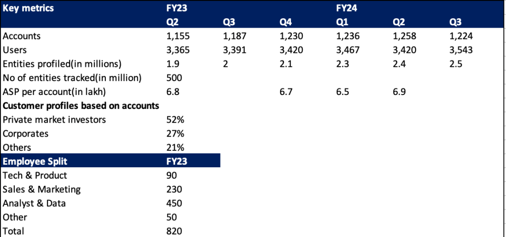 Tracxn was founded by Neha Singh and Abhishek Goyal in 2013. Both of the founders belong to venture capital world. Neha came from Sequoia Capital while Abhishek was with Accel Partners. Tracxn is entirely based in India while all its competitors are based overseas. Company generates revenue from subscriptions by selling quarterly and annual subscriptions to its platform. In FY23, annual subscriptions made up about 63% of the total subscriptions mix. Tracxn platform collects data from world over using government filings, digital footprints of companies and over 750 mn+ domains across emerging technology sectors. Company’s advantage resides in its tech stack and being based in India. Company’s operations are asset light but highly dependent on employee cost as it makes up about 89% of the cost structure hence the advantage of being based in India. Cloud hosting charges is the second largest expense in the cost structure and makes up about 3% of the cost structure. The key metrics to understand this business include number of accounts, number of users, entities profiled, daily active users and monthly active users which give you a sense of the economics of the business. Platform’s value will keep increasing as more data is added on the backend and network effects start kicking in as more players start to use the platform. On the backend, Tracxn tracks more than 500 million entities while the number of entities profiled on the platform has increased from 1.9 million in Q2FY23 to 2.5 million in Q3FY24. Number of customer accounts has grown from 1155 in Q2FY23 to 1224 in Q3FY24, although number of customer accounts saw a dip in numbers in previous quarters after recording growth. Each customer account gives access to multiple users. So one single entity takes one customer account and as the research team expands more users are added for a smaller fee relatively than the first account. Average realisation per user is at 2.4 lakhs per year. First user price stood at 5 lakhs per year. Average realisation per account stood at 6.9 lakhs per year as of Q2FY24. As an investor, you need to understand account growth will lead to faster revenue growth because initial cost of gaining access to service is higher and as you add users the cost per added user falls to an extent. Thus if company chooses to grow existing accounts, it will generate slower growth as compared to getting new customers in which will lead to higher generation of revenue growth. Another key metric to track includes employee strength as the business model requires interaction with customers to onboard them and continually service them. Also, the business requires backend team on both technology and data to maintain the platform and increase its value. I have provided the data on employee strength breakup and other metrics below.